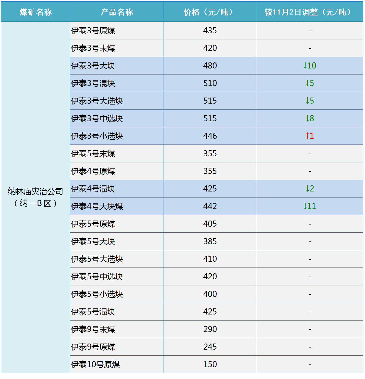 伊泰纳林庙灾治公司(纳一B区)11月3日调整部分煤价-11~1元/吨