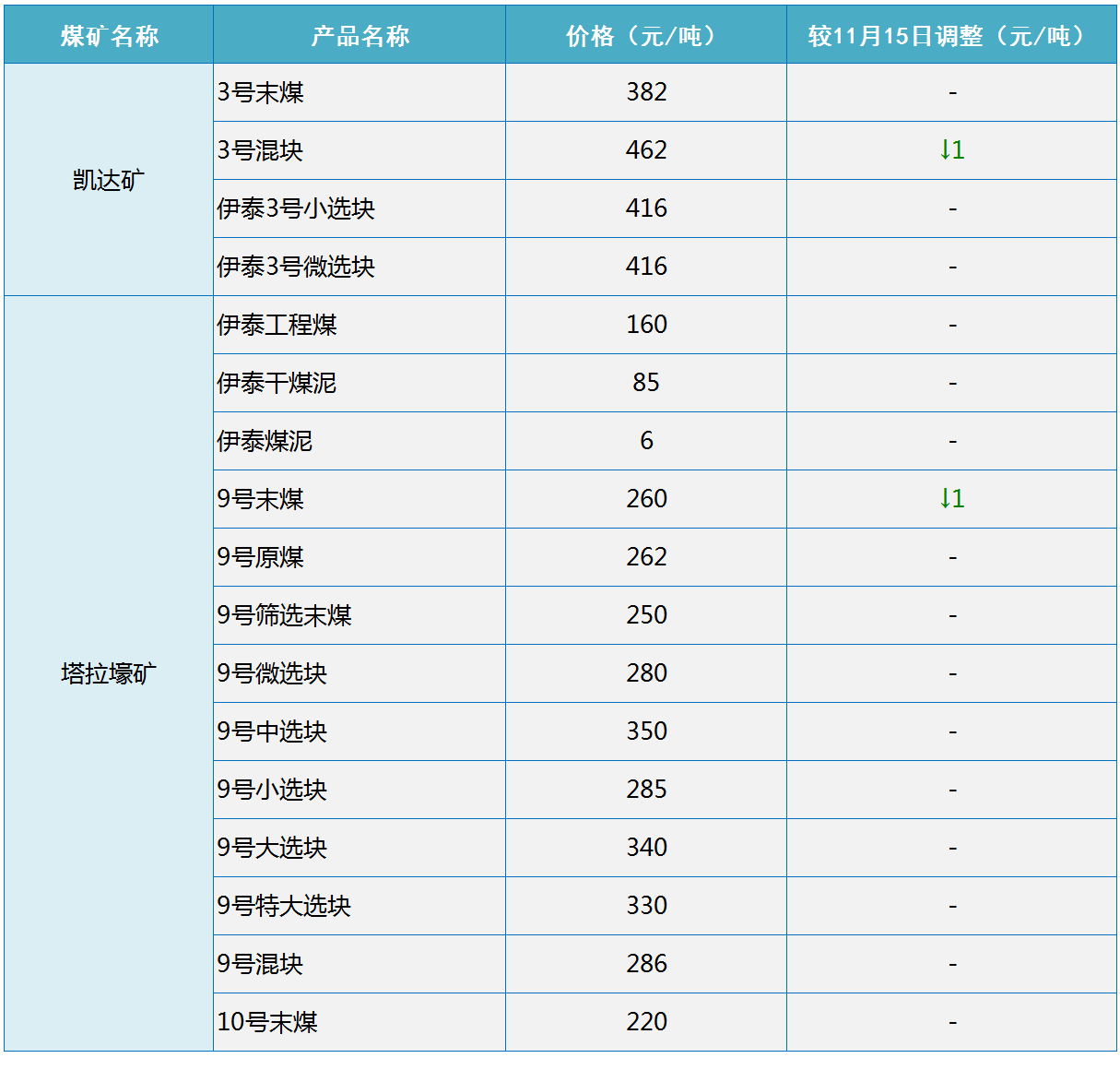根据伊泰集团2020年11月16日18点更新的销售价格显示,伊泰集团下调部分煤矿煤炭坑口销售价格1元/吨,具体如下: