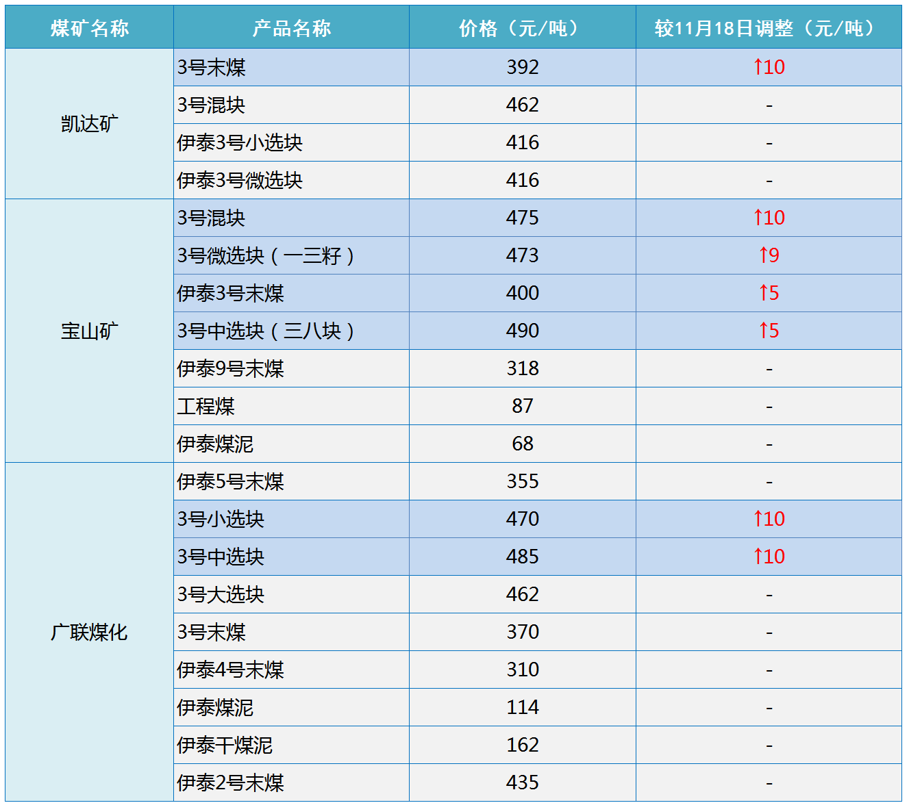 根据伊泰集团2020年11月19日18点更新的销售价格显示,伊泰集团上调部分煤矿煤炭坑口销售价格5-10元/吨,具体如下: