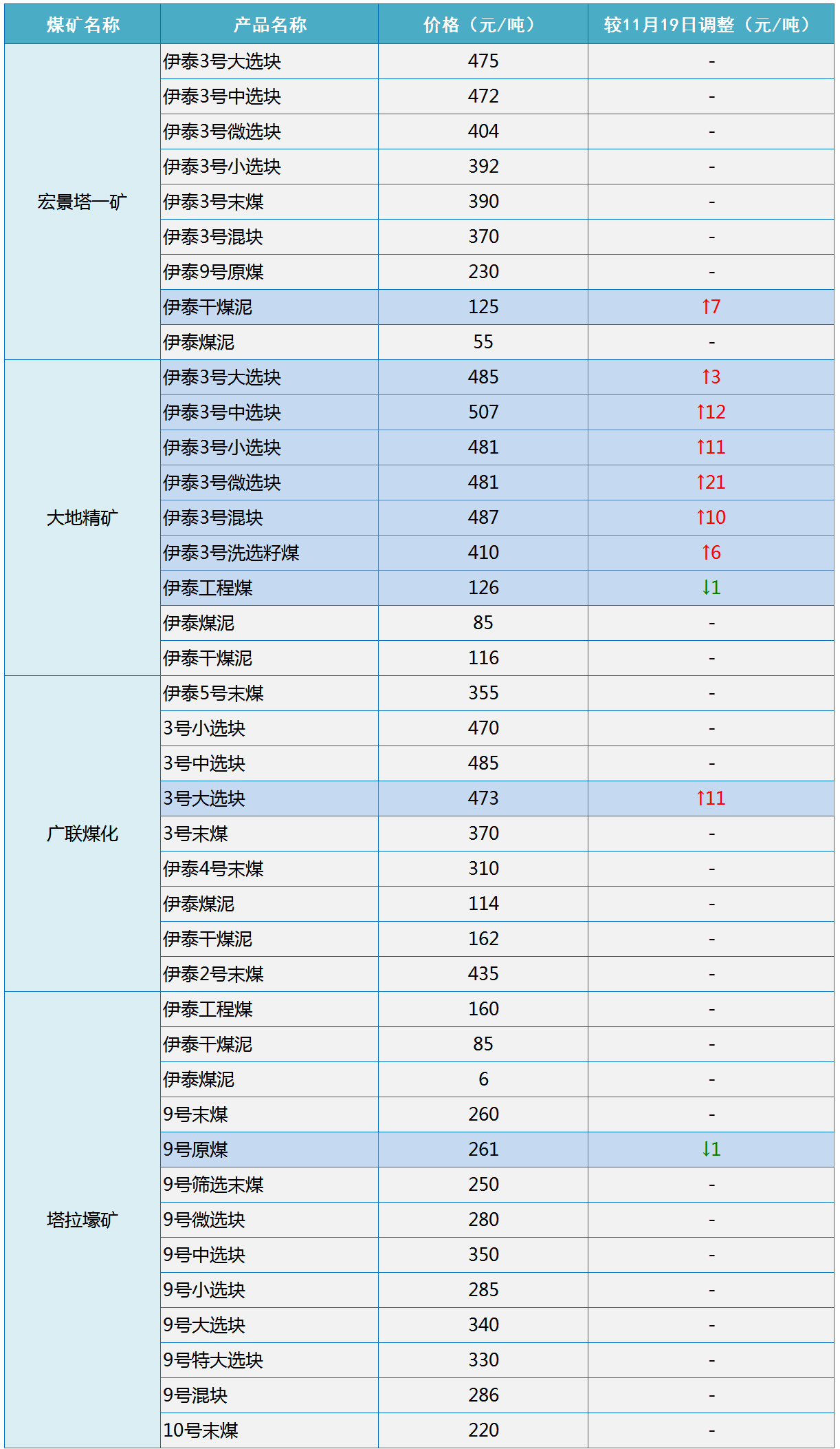 伊泰集团11月20日调整部分煤炭坑口销售价格-1~21元/吨
