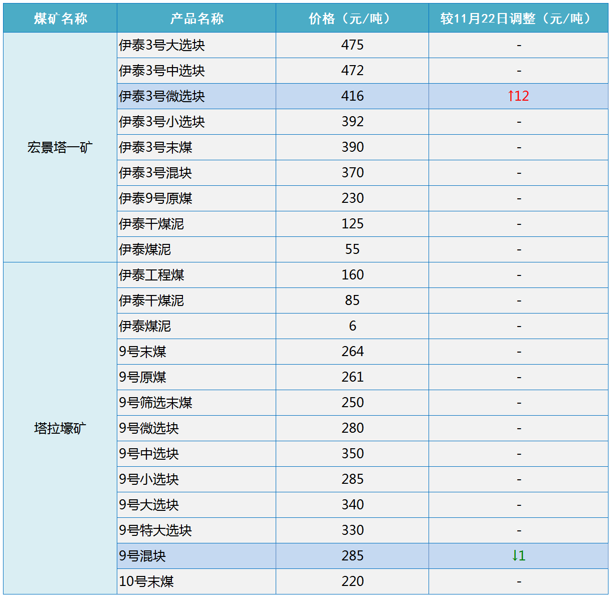 伊泰集团11月23日调整部分煤炭坑口销售价格-1~12元/吨