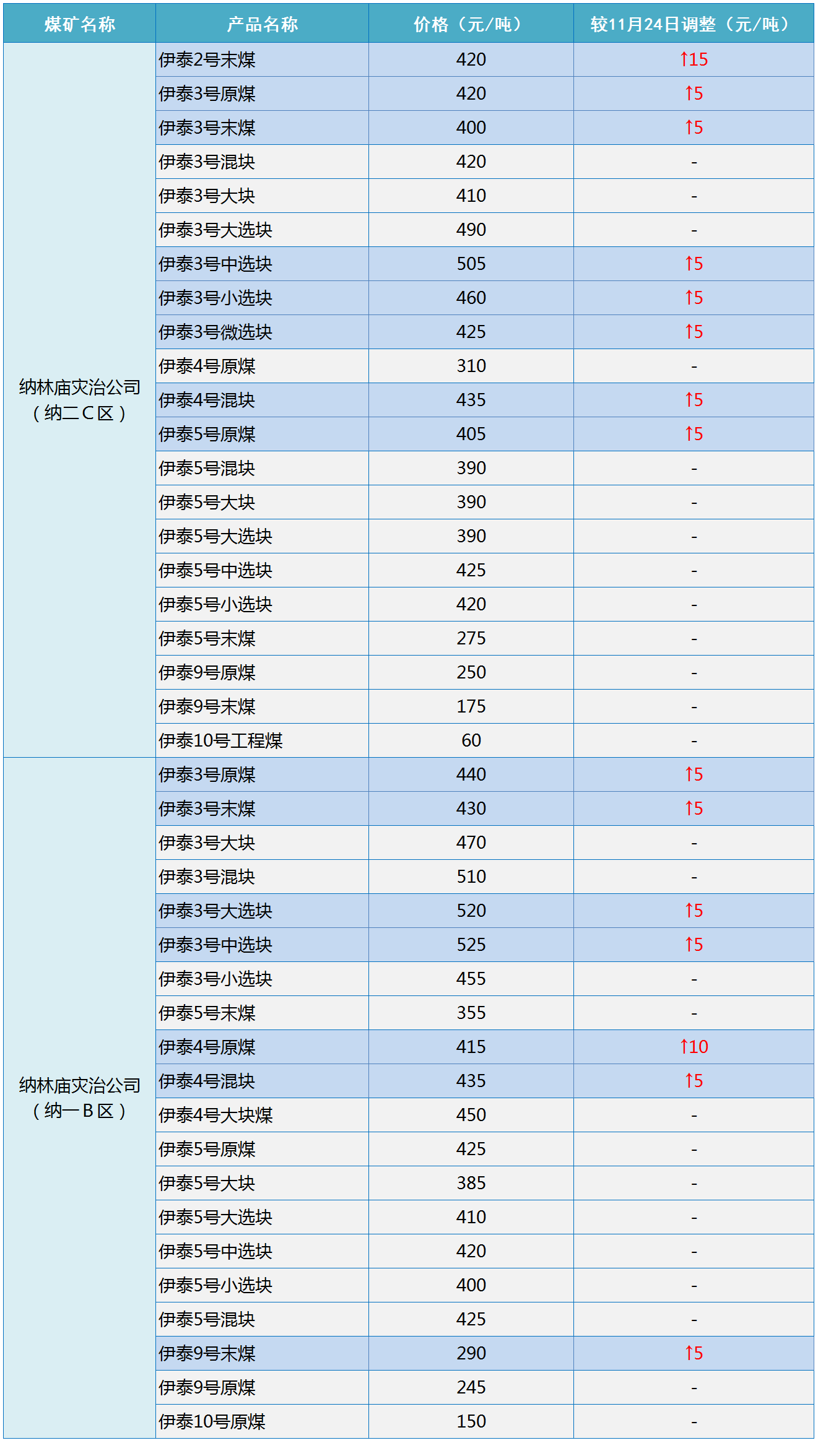 根据伊泰集团2020年11月25日18点更新的销售价格显示,伊泰集团上调部分煤矿煤炭坑口销售价格5-15元/吨,具体如下: