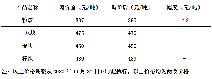 内蒙古赛蒙特尔煤矿11月27日起上调粉煤价格8元/吨