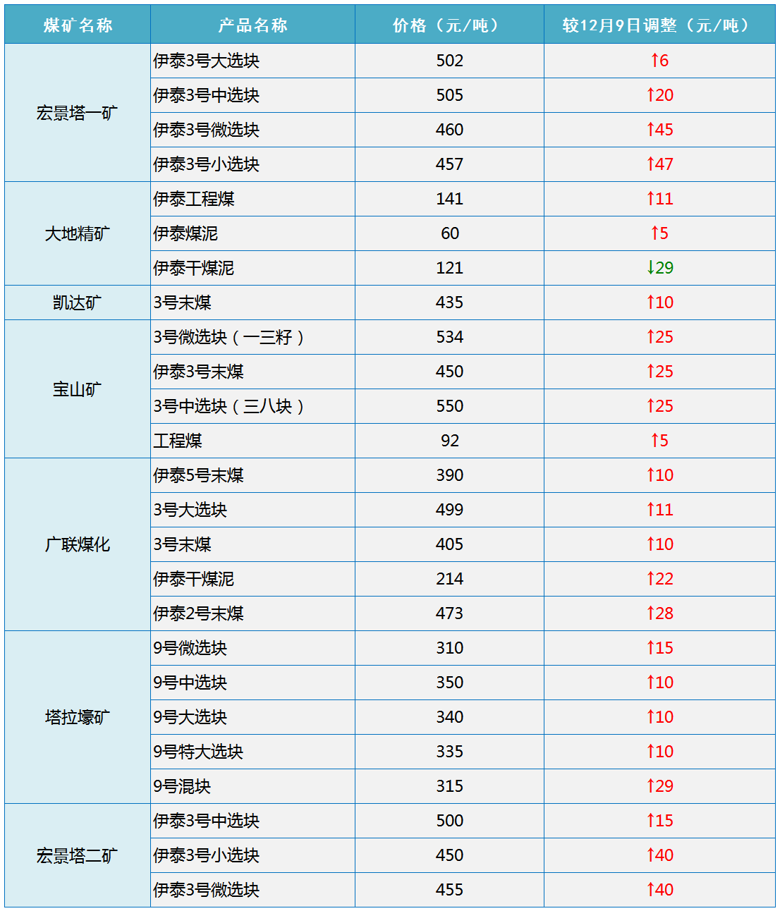 根据伊泰集团2020年12月10日18点更新的销售价格显示,伊泰集团调整部分煤炭坑口销售价格-29~47元/吨,具体如下: