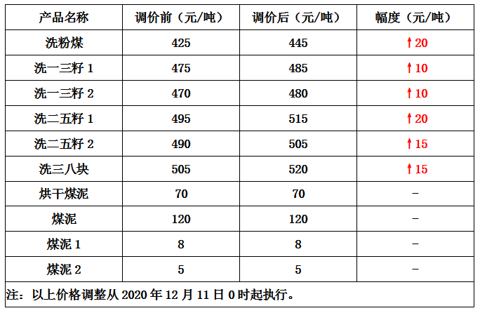 内蒙古高家梁煤矿12月11日上调煤炭价格15元/吨