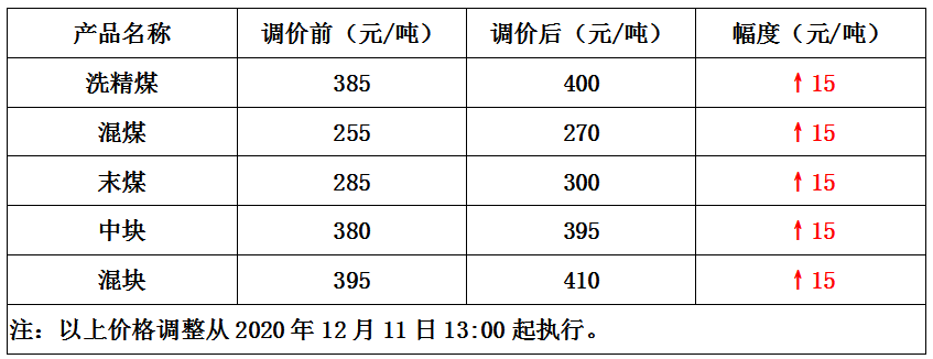 内蒙古高家梁煤矿12月11日上调煤炭价格15元/吨