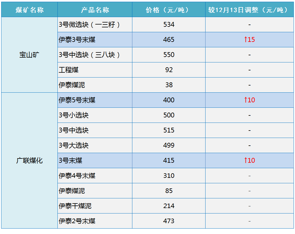 根据伊泰集团2020年12月10日18点更新的销售价格显示,伊泰集团上调部分煤炭坑口销售价格10-15元/吨,具体如下: