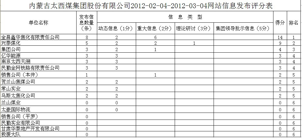内蒙古太西煤集团股份有限公司2012-02-04-2012-03-04网站信息发布评分表
