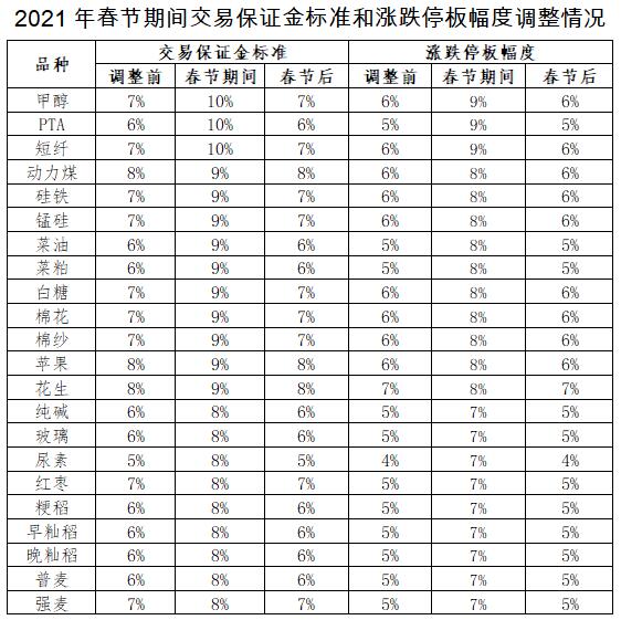一、自2021年2月9日结算时起,PTA、短纤和甲醇品种交易保证金标准调整至10%,涨跌停板幅度调整至9%;花生、白糖、棉花、棉纱、菜粕、菜油、苹果、动力煤、硅铁和锰硅品种交易保证金标准调整至9%,涨跌停板幅度调整至8%;普麦、强麦、早籼稻、晚籼稻、粳稻、红枣、纯碱、玻璃和尿素品种交易保证金标准调整至8%,涨跌停板幅度调整至7%。动力煤2103合约交易保证金标准仍为15%。