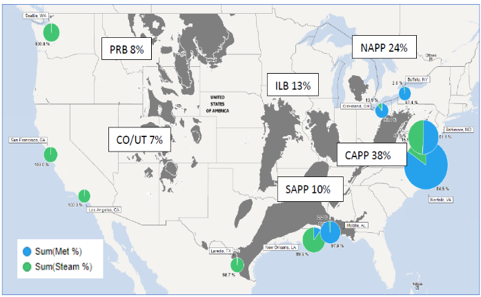 动力煤出口发运港口主要为,马里兰州的巴尔的摩港(Baltimore)2020年出口发运923万吨,上年为990万吨;西北华盛顿州西雅图(Seattle )发运428万吨,上年为436万吨;密西西比河口新奥尔良(New Orleans)发运381万吨,上年为990万吨;还有弗吉尼亚州的诺福克港(Norfolk)发运320万吨,上年为246万吨。美国冶金煤主要产于东部阿帕拉契亚煤盆地的北部,出口发运的港口主要为弗吉尼亚州的诺福克港和马里兰州的巴尔的摩港。