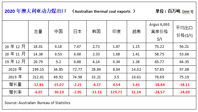 据阿格斯(Argus)援引澳大利亚联邦统计局(Australian Bureau of Statistics —ABS)发布的数据显示,2020年12月,澳大利亚动力煤出口1801万吨,比2019年12月的2079万吨下降13.4%,比11月份的1438万吨增长25.2%。