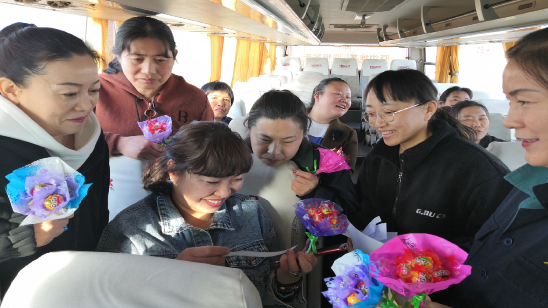 一大清早,在通勤车上,公司工会主席代表公司党政工领导班子向刚下夜班准备坐车回家的女职工们致以节日的问候,并送上了诚挚的祝福。女工委主任和工作人员为每位女职工赠送了福利购物卡和手工制作的糖果花束。“这份小礼物很贴心,瞬间治愈了刚下夜班疲倦的我.....”,女工王晓青边摆弄着手里的糖果花束,边感慨地说道。