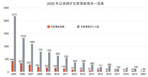 经过十几年的努力,2020年,煤矿瓦斯防治工作取得历史最好成绩:新中国成立以来首次实现全年未发生一次死亡10人以上的重大煤矿瓦斯事故;全国24个产煤省(区、市)有18个实现瓦斯“零事故”,全国煤矿瓦斯事故起数、死亡人数比领导小组成立之初的2005年分别下降98.3%、98.6%。