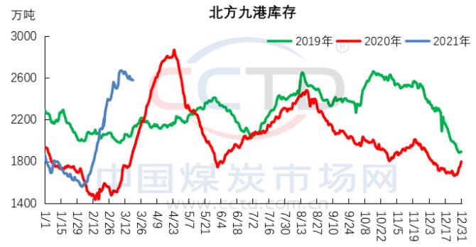 北方港口库存冲高后下降。3月份以来,大秦线“开天窗”数量增加到9个,日均发运量维持在116万吨/日左右,环比上月下降6.0%,而港口调出整体低于调入,北方港口库存在相当长一段时间内居于高位。本月中旬起,随着港口锚地船舶增多,下游拉运增加,港口调出量明显增加使得库存小幅下降。截止3月19日,环渤海九港(不含天津港)库存为2577万吨,较年初低点增加1015万吨,同比增加682万吨。