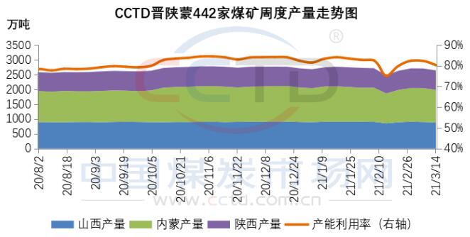 CCTD中国煤炭市场网监测数据显示,3月14日当周,晋陕蒙442家煤矿产量为2643万吨,周环比下降2.4%,产能利用率为80.3%,周环比下降2.0个百分点。