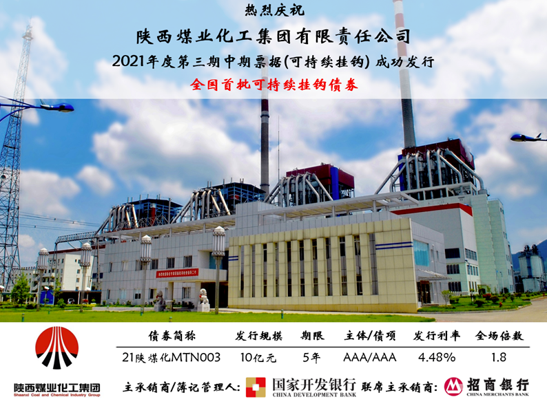 5月6日,陕煤集团成功发行了一笔可持续挂钩发展债券(简称21陕煤化MTN003(可持续挂钩))。本期中期票据由国家开发银行牵头、招商银行联主发行,规模10亿元,期限5年,票面利率4.48%。陕煤集团成为发行全国首批可持续发展挂钩债券的八家企业之一,也是唯一一家煤炭行业,此次发行是全国首批首单,期限最长的发行企业。