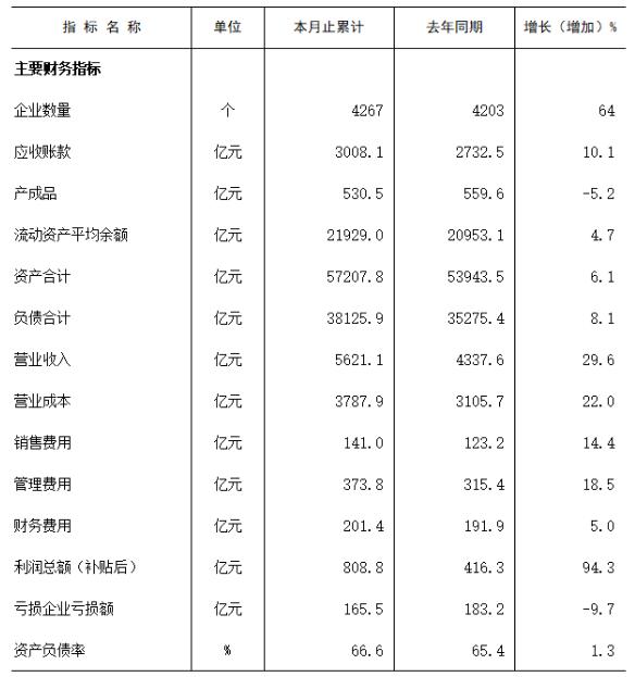 指标显示,一季度,4267家规模以上煤炭企业营业收入5621.1亿元,同比增长29.6%,增幅比规模以上工业行业平均低9.1个百分点;营业成本3787.9亿元,同比增长22.0%;应收账款3008.1亿元,同比增长10.1%;利润总额(补贴后)808.8亿元,同比增长94.3%,增幅比规模以上工业行业平均低42个百分点。