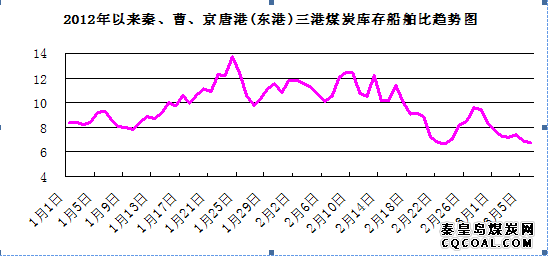 2、主要发运和接卸港口的煤炭库存进入合理区域。秦皇岛海运煤炭市场的监测数据显示,其一,2月中旬之后,秦皇岛、曹妃甸、京唐港(东港区)等北方主要煤炭发运港口的煤炭库存指标逐渐好转,目前上述三港的煤炭库存与船舶比(参见附图)正在逐渐进入合理估值范围(合理估值:5.5-7.0;大于7.0时偏高:小于5.5时偏低),此前的高库存状况对该地区市场动力煤价格的压制作用明显减弱。