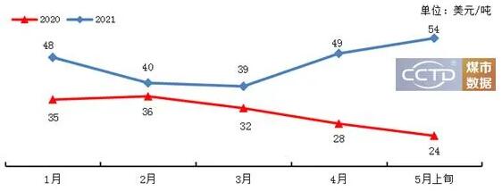 2021年中国终端用户因此增加了从其他国家的进口量来作为补充,而印尼凭借着价格和地理优势,成为动力煤进口的主要来源国。从船运数据可以看出,今年1月份印尼发往中国海运煤数量同比有所增加,但自2月份开始发运量有所减少,尤其在3月份较为突出,主要是由于3月印尼到华南海运费持续攀升对终端采购情绪形成抑制,再加上当月电厂补库需求较为低迷,导致印尼煤发运量明显减少。从4月和5月上旬的数据来看,印尼煤发运量同比均有所减少,究其原因主要是受现货供应偏紧影响。