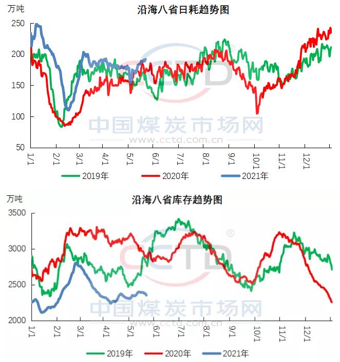 终端库存维持低位。今年以来,我国经济持续复苏,工业企业生产保持良好态势,加之近期国内多地气温升高,沿海八省终端日耗高位运行,库存维持低位。CCTD中国煤炭市场网监测数据显示,截止5月20日,沿海八省煤炭日耗192万吨,较年初低点增长74.7%,同比增长11.8%。沿海八省煤炭库存2351万吨,较年初高点减少449万吨,同比减少535万吨。