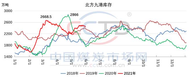 进入6月份,月初鄂尔多斯地区煤管票据恢复,供应量有所增加。但主产地煤矿安检、环保检查形势依旧严峻,供给量未见大幅增加。加之市场看空氛围下,上游发运积极性减弱,港口调入瓶颈显现。受封航等因素影响,调出量虽有波动,整体仍维持高位。在上游供应不足,而下游需求旺盛的带动下,预计港口库存将呈现维持震荡下行趋势。