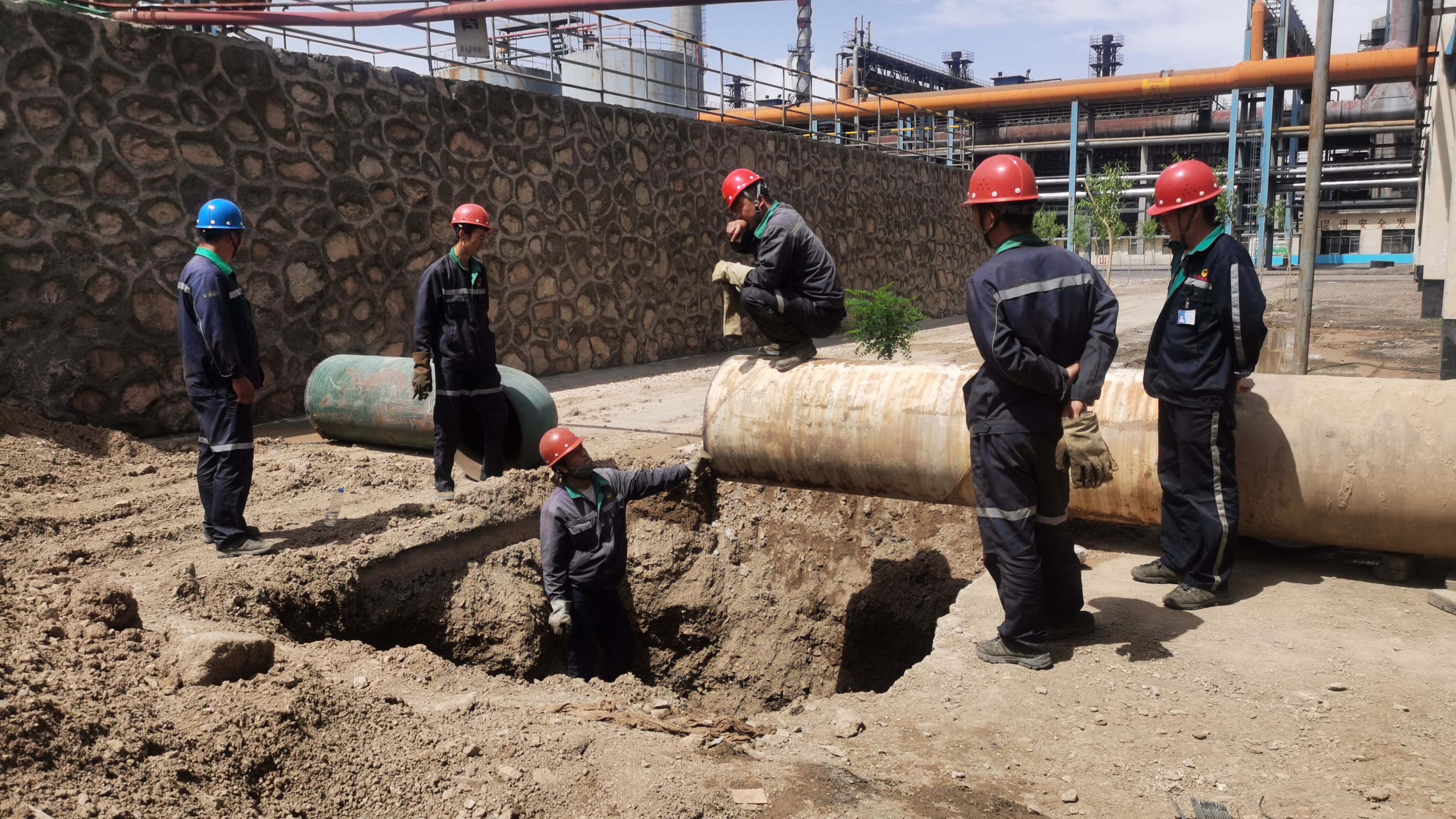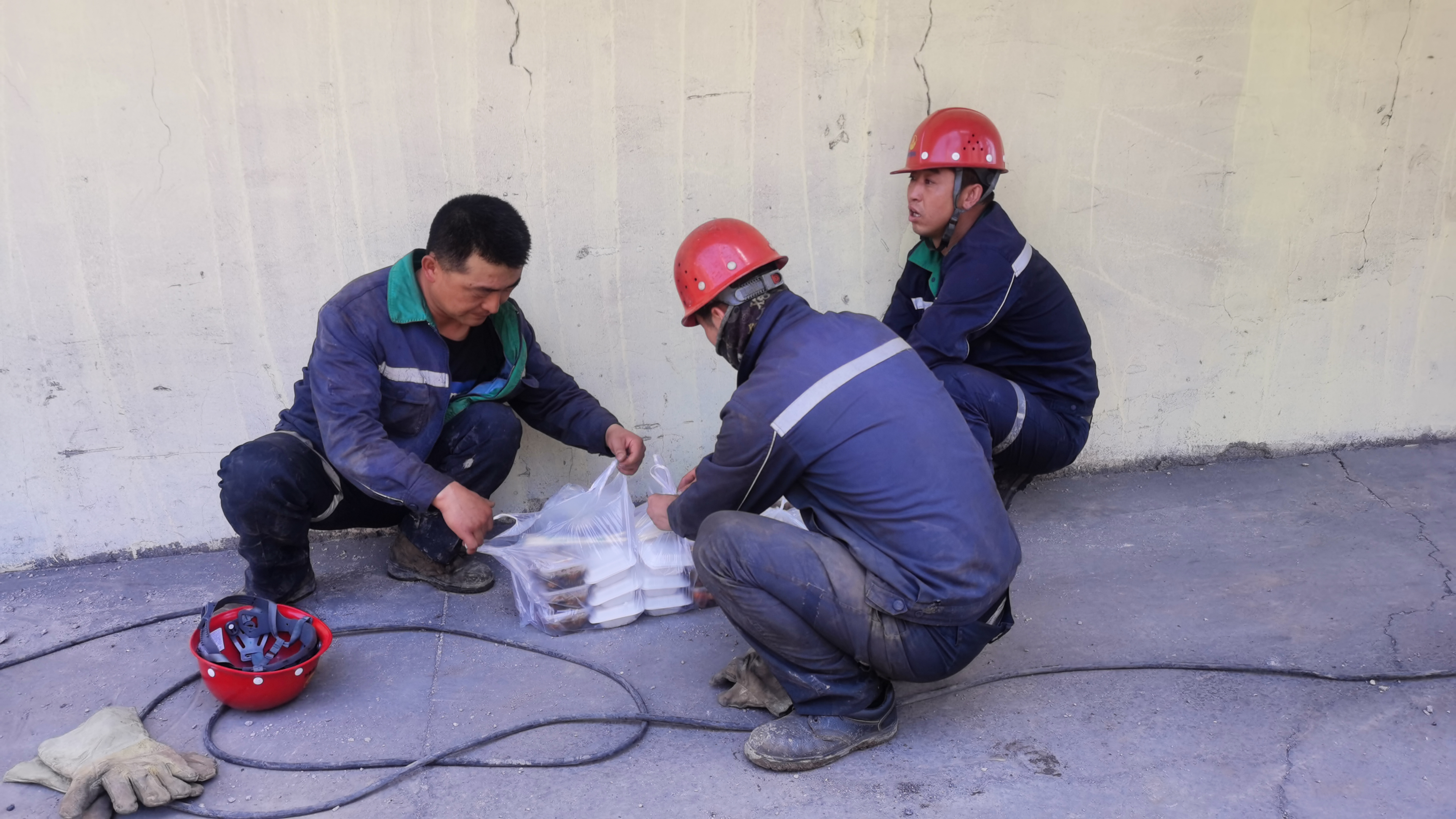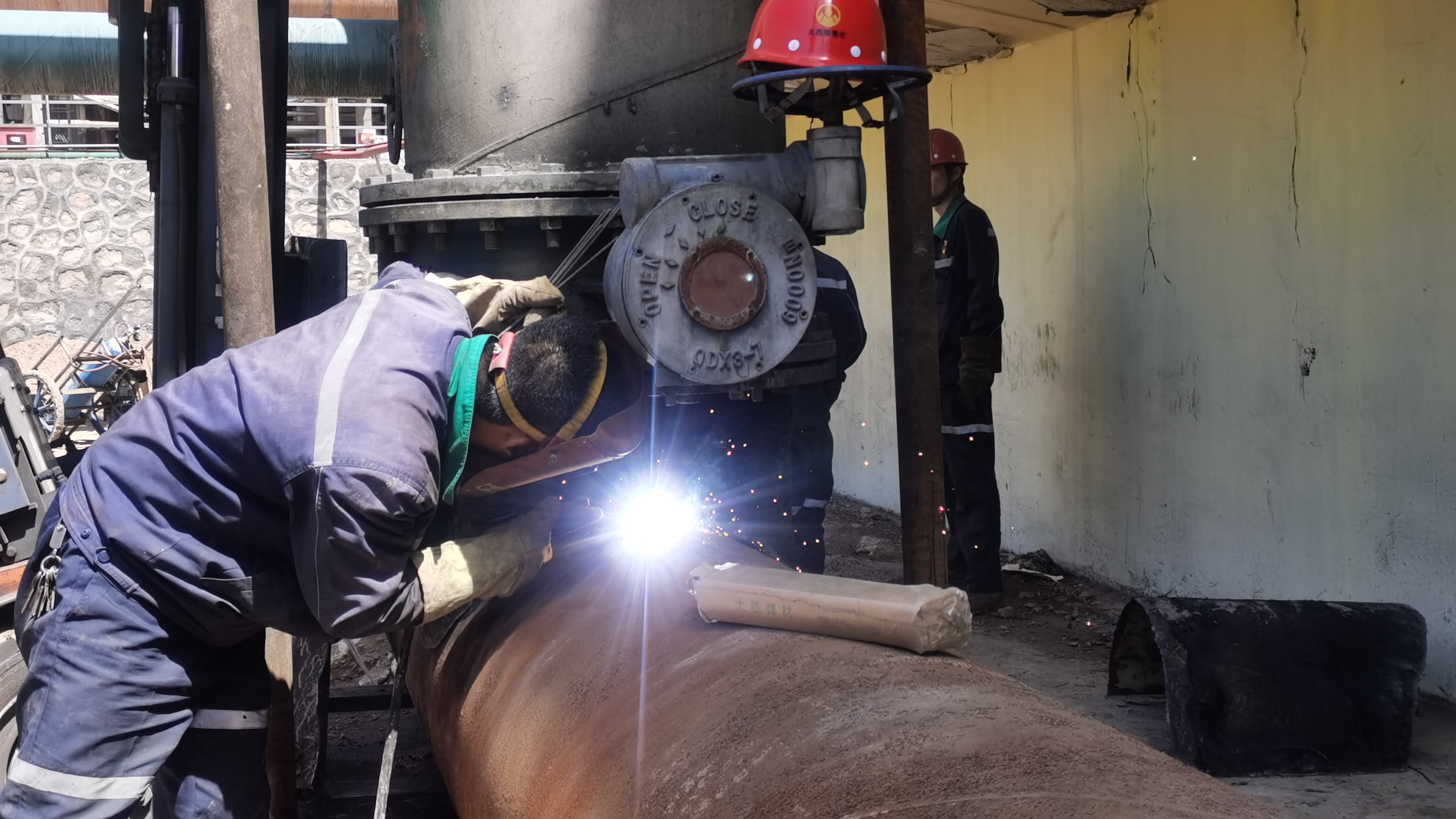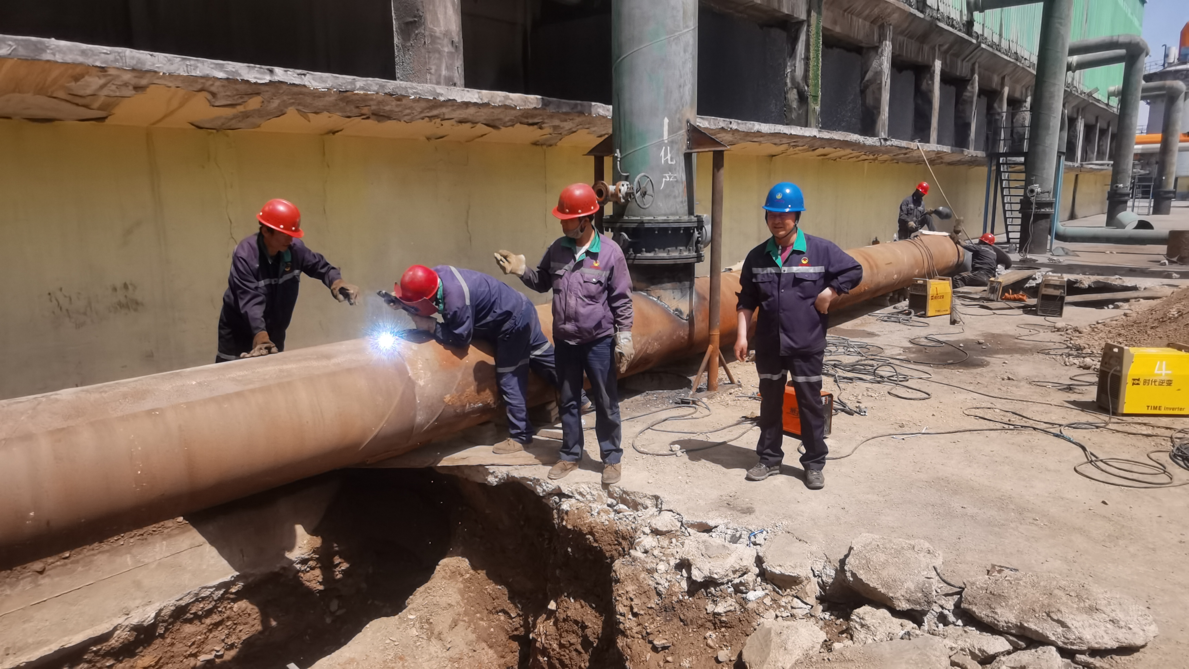 6月6日下午14点开始,化产、机修车间合理安排人员,分工合作,封堵破口、预制弯头接口焊接管道接口,为抢修工作的顺利进行做好充足的准备工作,全力以赴尽快恢复生产。方案确定,说干就干,切割、预制管道弯头,管焊工在泥水中争分夺秒进行处理。即将进入伏天的天气,气温骤升,机修工顶着烈日,爬进坑道,在狭小的空间作业,汗水浸透衣服,焊花闪闪,渴了就在下面喝口水。为了节约时间,食堂准备的加班饭机修工就在现场吃。