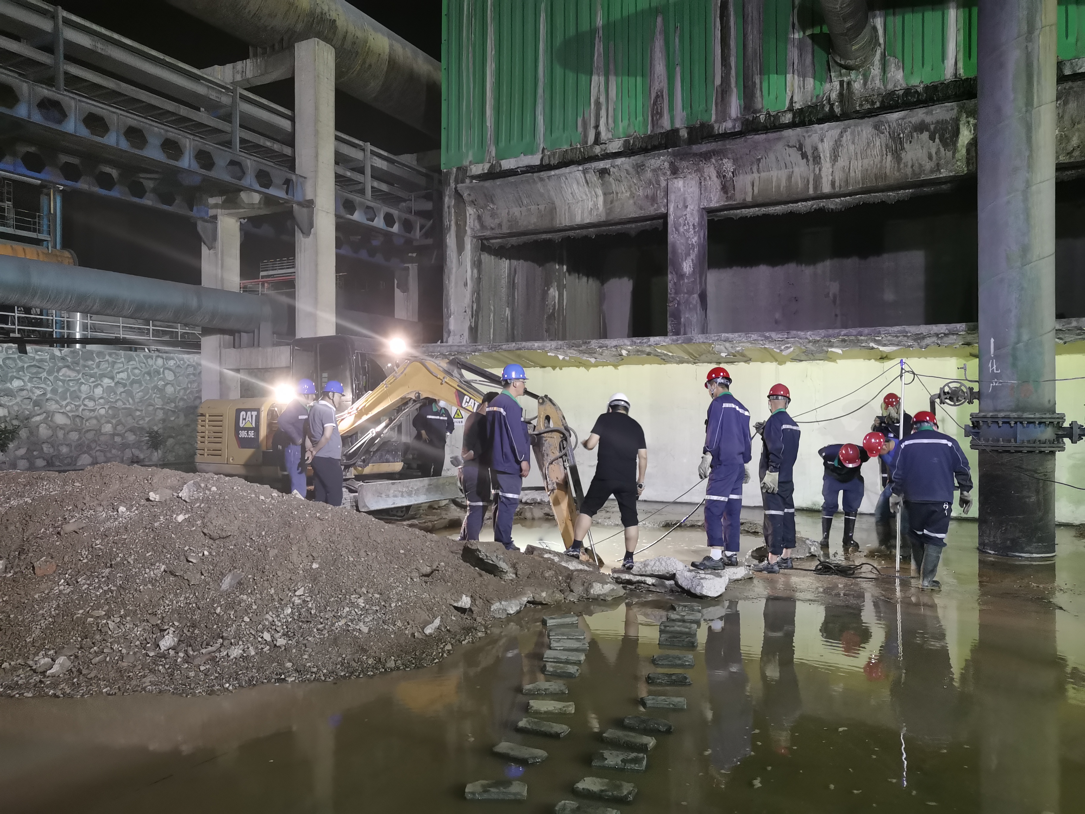 循环冷却水是焦化生产中举足轻重的系统,承担着煤气初冷器、终冷塔等设备的煤气冷却降温和各项运行温度指标的控制,尽快恢复化产后续循环水冷却系统迫在眉睫。由于地下管道埋深达2米,维修施工难度较大,领导即刻召开现场抢修会,在最大限度的减少损失的情况下,何铭基与赶到的总工程师王书生、副总工程师陆建斌合议,下令初步降低焦炉出焦孔数至106孔/日,立即调度储运车间挖掘机进入现场开挖渗漏区域实施抢修。同时副总经理张晨安排工作人员为现场抢修人员送来了水和面包,温暖着现场的每一个人。