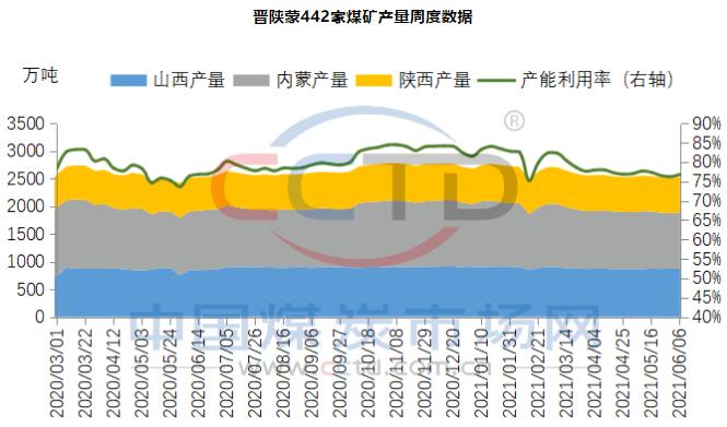 近期,煤矿安全事故多发,产地安监力度加大,煤矿生产谨慎,部分矿停产检修或倒工作面,在产煤矿严格按核定产能生产。增产保供在安全事故频发下效果不及预期,截止6月6日,晋陕蒙442家煤矿产能利用率为76.8%,月环比下降0.9%,产量月环比减少1.1%。