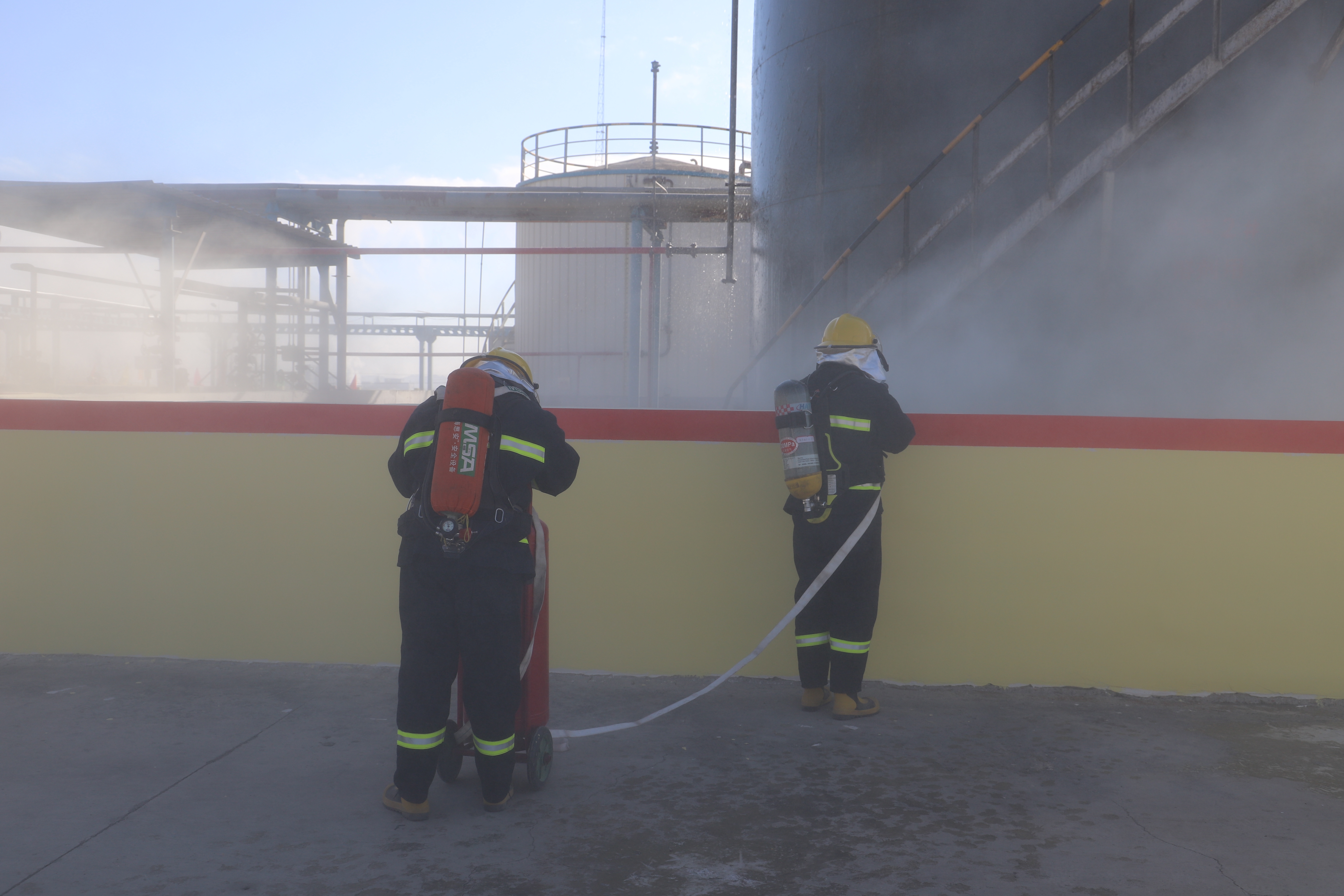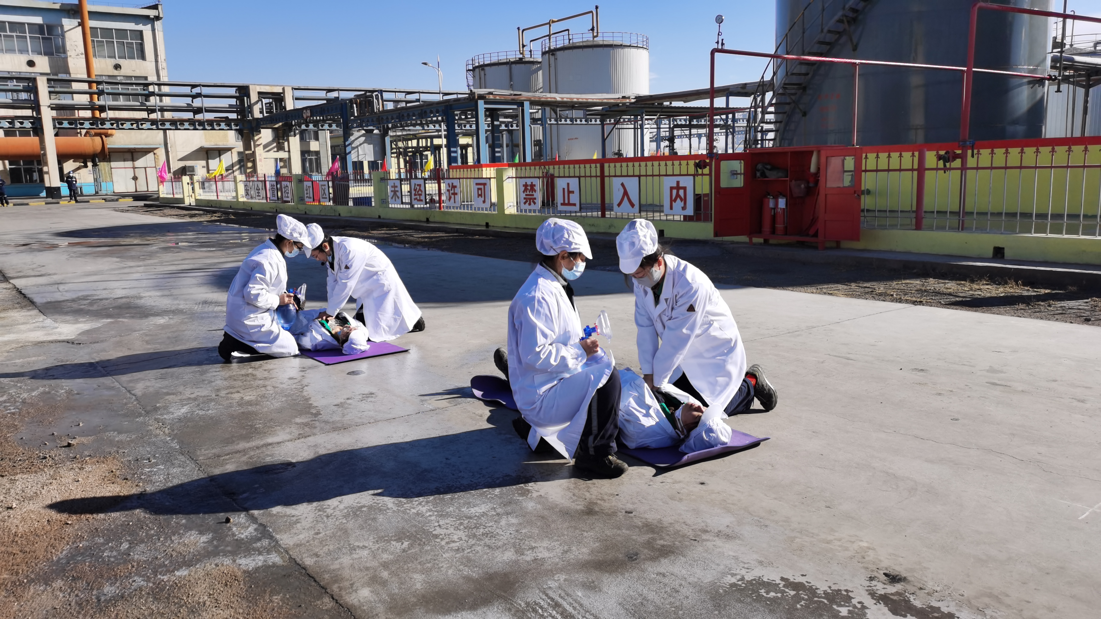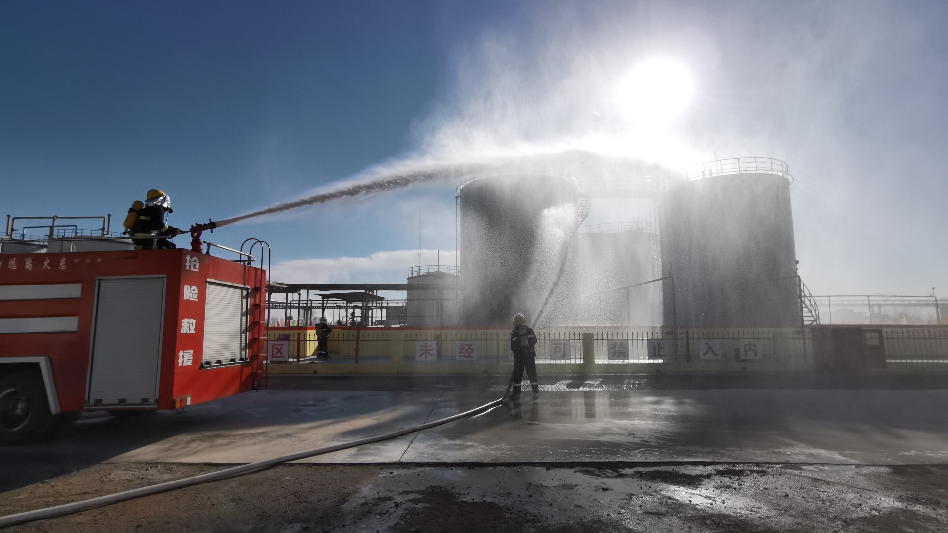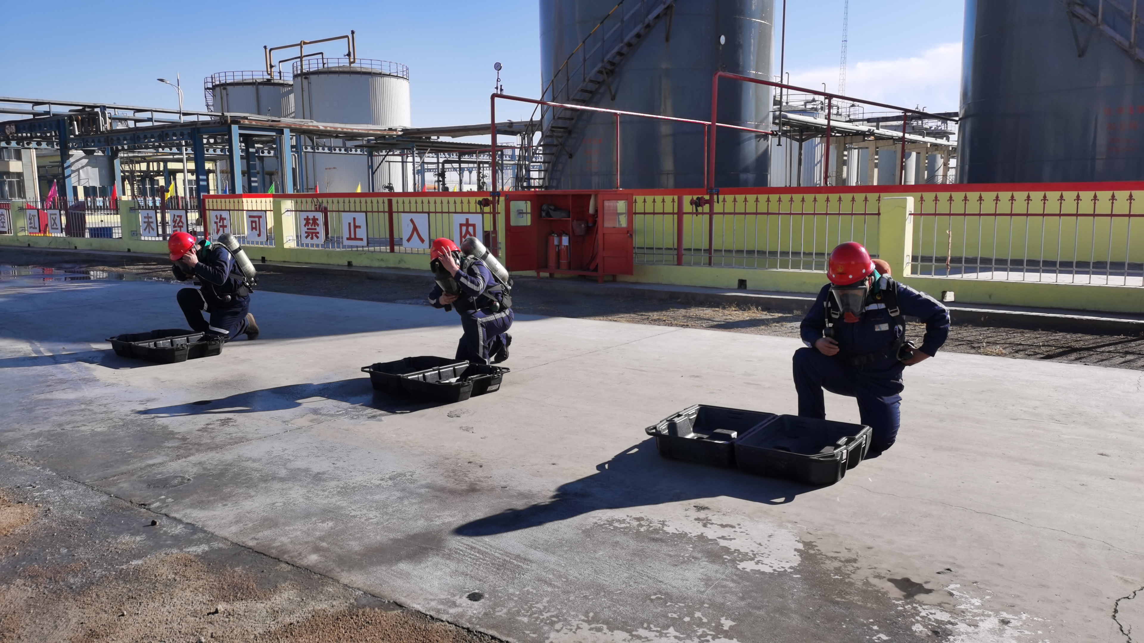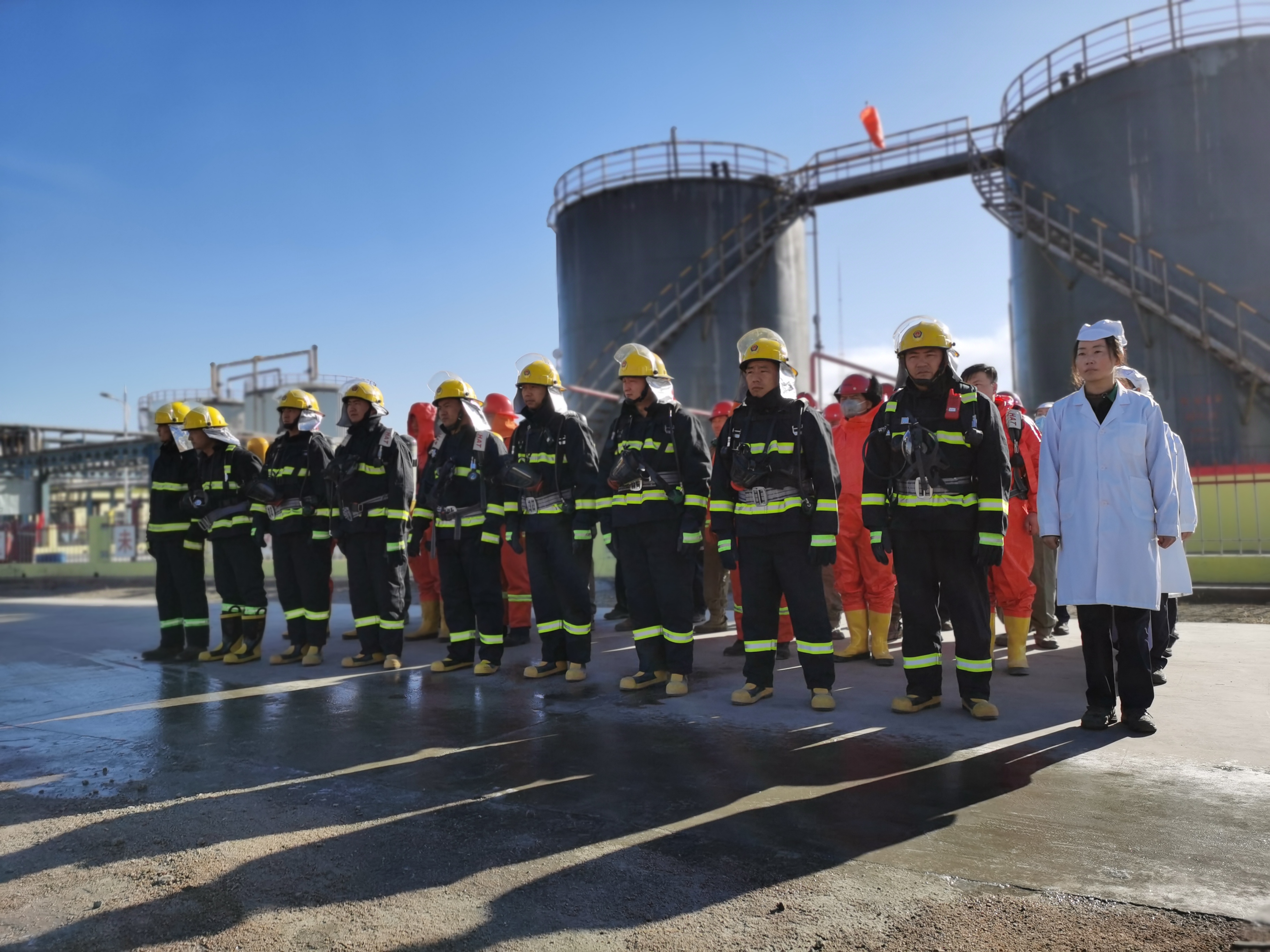 在观摩结束后,在化产生产系统综合罐区,点验了企业消防应急救援队伍及装备;进行了铺设消防水带、消防车出水和人员自救消防应急演练;展练了正压式空气呼吸器佩戴、心肺复苏急救等消防器材的使用。