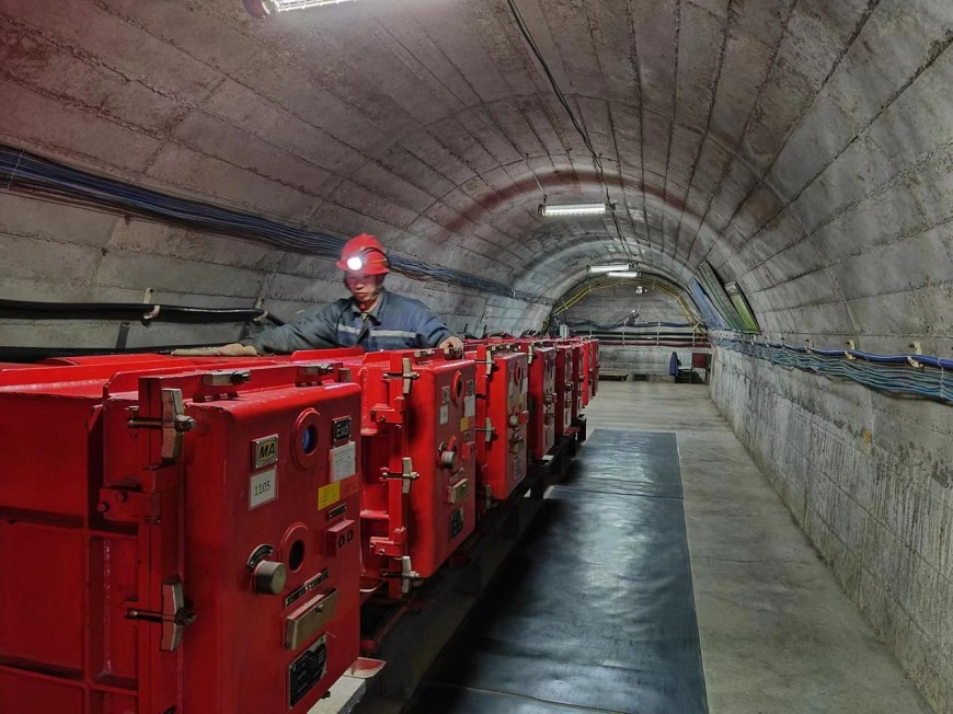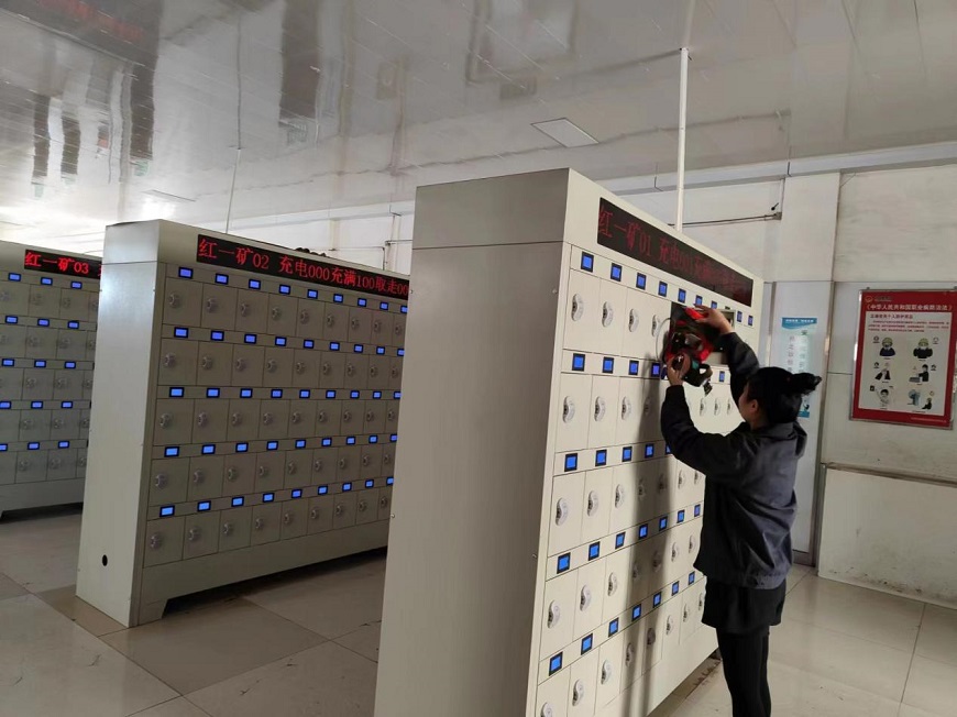 太西煤集团民勤实业有限公司红沙岗一号煤矿充灯房,充灯工负责矿灯充电工作,矿灯是每名作业人员入井时必须佩戴的,矿灯是矿工的眼睛。