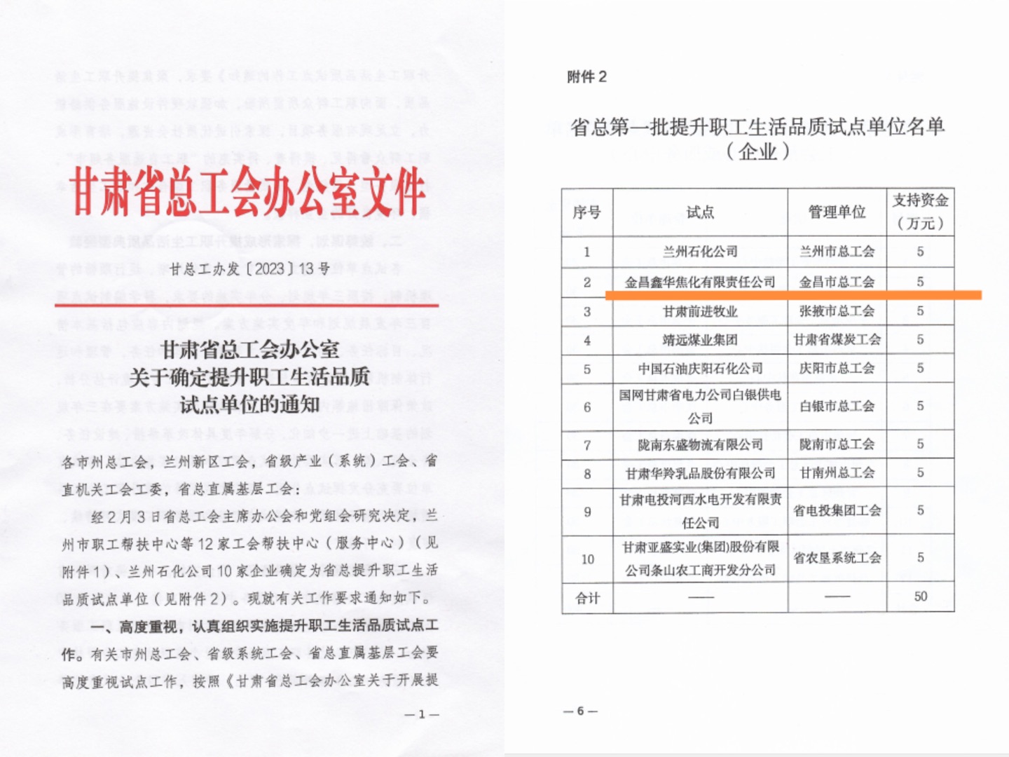 2023年2月14日甘肃省总工会印发《关于确定提升职工生活品质试点单位的通知》,金昌鑫华焦化公司等10家企业确定为甘肃省总提升职工生活品质试点单位,这是金昌市唯一一家企业被入选。这也是继2021年甘肃省唯一一家企业被中华全国总工会列为“企业提升职工生活品质塑造幸福生活环境试点单位”之后的重要荣誉。省总对列入第一批“企业提升职工生活品质试点单位”奖励支持资金5万元。
