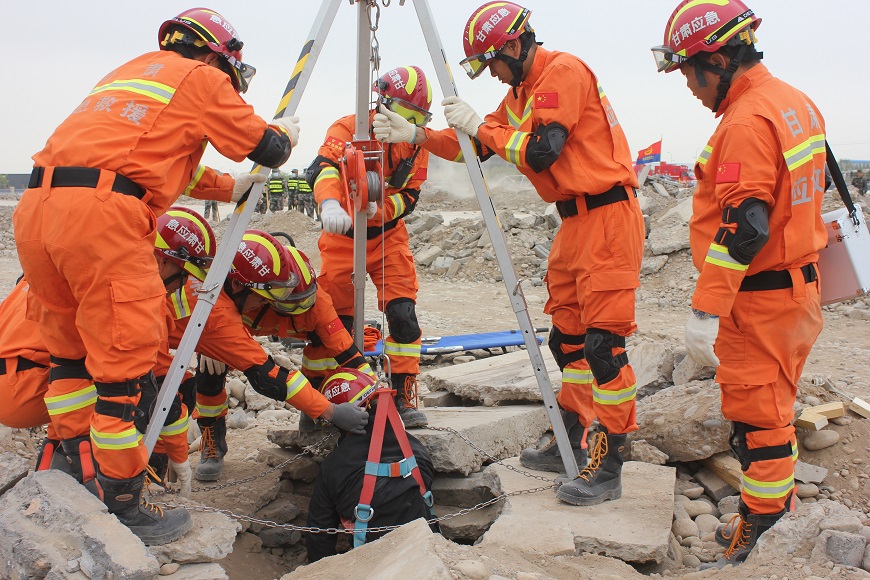 演习开始后,太西煤集团民勤实业有限公司矿山救援中队立即组织人员携带破拆、顶撑、救援三角架等装备赶赴现场进行搜救。到达现场后,立即制定搜救方案并实施搜救,通过敲击、呼喊、勘查等方式,搜索浅表层被困人员。经过仔细搜寻在一处废井中发现被困人员,立即利用破拆、切割、顶撑等工具打开救援通道,在井口架设救援三脚架将搜救人员缓降至井底,对伤员进行简单包扎处置后给伤者穿好救援背带缓慢提升至地面,移交现场医护人员进行救治,然后转送到临时医疗点进行进一步治疗。搜救人员有序撤离搜救区域,在集结区待命。至此,太西煤救援中队顺利完成演习科目。待所有的演习科目完成后,抗震救灾指挥部立即召集所有参演部门到主席台前集结,宣布演习结束,并对参加演习队伍和演习科目作出点评和总结。