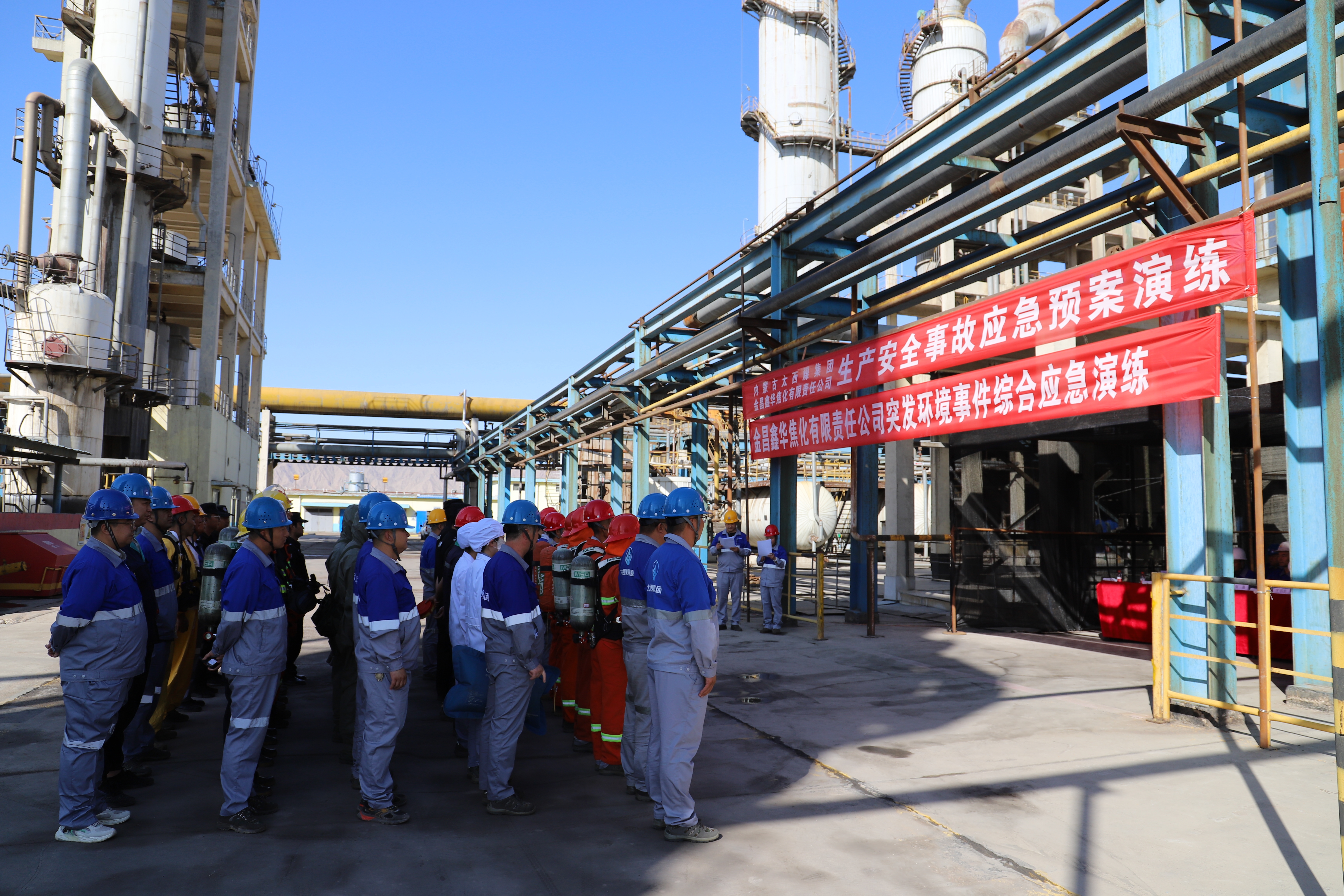为加强安全生产应急管理工作,有效提升突发事件应对及处置能力,锻炼应急救援队伍,按照“安全生产月”应急演练计划安排,7月17日上午,金昌鑫华焦化公司组织开展粗苯泄漏着火综合演练及环境突发事件应急预案演练。集团公司副总经理赵玉福、张晨出席活动,公司常务副总经理何铭基、总工程师王书生、安全副总经理刘学军以及集团公司安监总部领导参加。