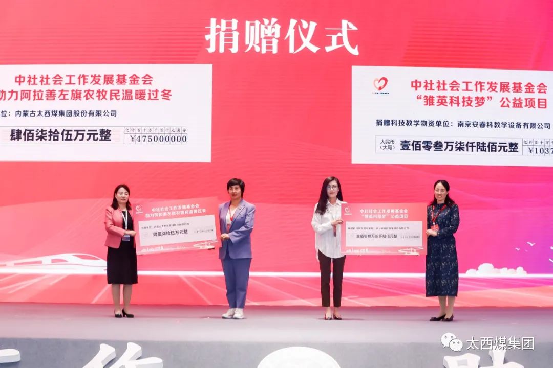 大会举行了捐赠仪式。内蒙古太西煤集团股份有限公司向中社社会工作发展基金会"共筑乡村梦"基金捐赠475万元,助力阿拉善左旗农牧民温暖过冬。