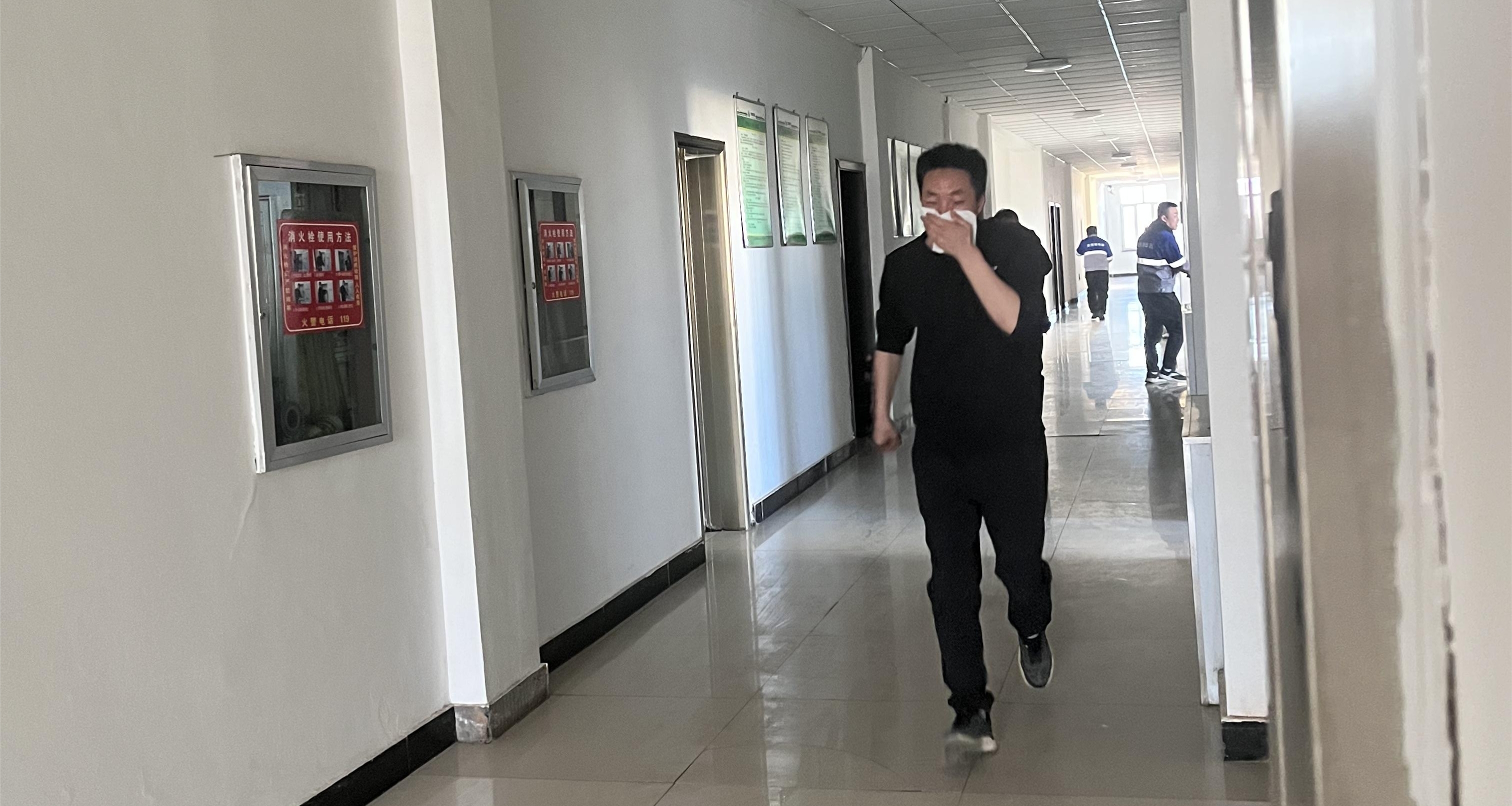 本次演练地点设在男浴室内,当工作人员巡查至浴室内发现预设着火点起火后,立即向调度室报告着火情况。随后,红一矿矿长刘勇迅速通知启动预案,紧急疏散办公楼所有人员并沿着安全通道到达地面安全地点,同时请求矿山救援中队携带救火装备前往着火点灭火。此次演练于下午16时开始至17时结束,在矿山救援中队的协助下,迅速扑灭了着火点。