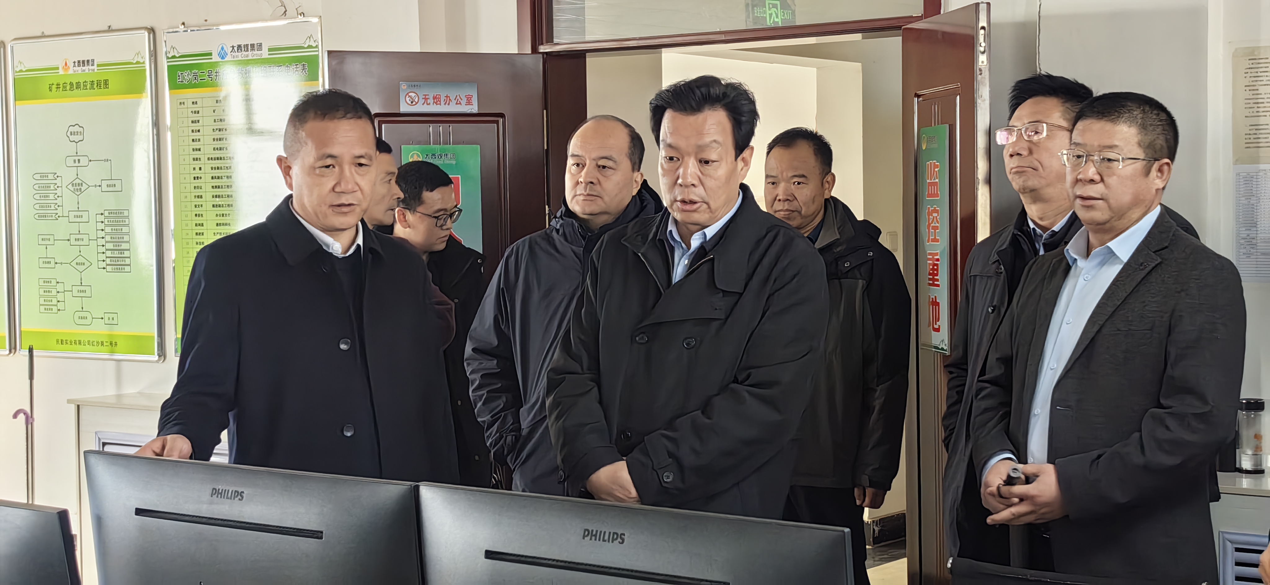 陈得信在太西煤集团民勤实业公司红沙岗二号井调度监测集控中心就企业安全管理、煤炭销售、矿井储量及生产能力、“三化”改造等方面听取了民勤实业公司总经理王俊的汇报。并现场查看了井下人员定位、瓦斯监测监控和通风系统等运行状况。
