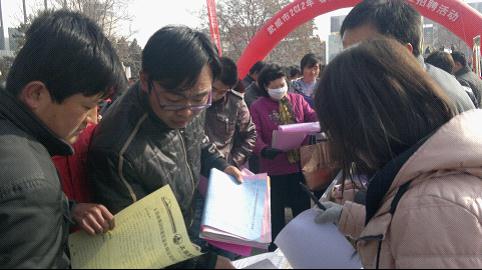 图二:工作人员招聘现场发放招工简章并接受应聘人员咨询