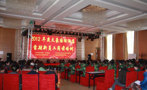 为规范服务行为,提升服务质量,太豪国际酒店加强对新入职员工的岗前培训工作。于3月16日,对新入职的30名员工进行了为期17天的2012年度首期新员工入职培训,第二期培训也于4月10日开始。培训内容主要包括酒店礼仪、仪容仪表规范、酒店基本规章制度、素质拓展、消防安全及节能降耗知识等。培训方法采取聘请专业人员授课,注重操作技能培训,并辅之军事训练,强化培训效果。酒店各部门还专门设立了为新员工介绍酒店基本情况的导航员,对新员工进行实际工作中的引导,便于新员工尽快融入到新的工作环境中来。例如餐饮部定期进行情景模拟练习;保卫部进行灭火应急救火模拟练习;客房部进行客房服务流程培训等。同时酒店对管理人员也进行了服务理念的培训,每天要求各部门管理人员须督导部门员工进行不少于15分钟的开口微笑服务训练。