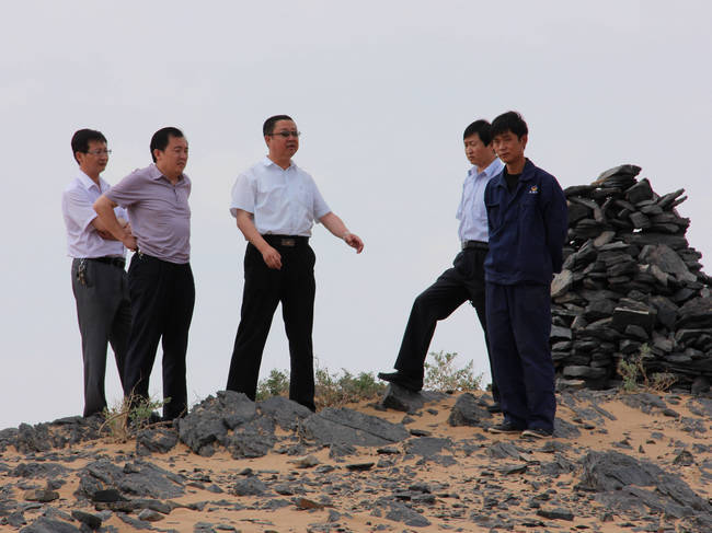 宋宏亮行长(左二)在石墨产地现场了解情况,民勤实业有限公司财务总监龚文波(右三)陪同考察。