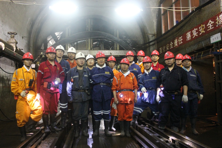 准备站罐升井时,董事长和同行的工作人员在井下运输大巷合影留念。