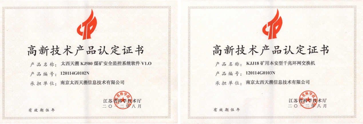 矿用本安型千兆环网交换机被江苏省科学技术厅认定为江苏省高新技术产品。