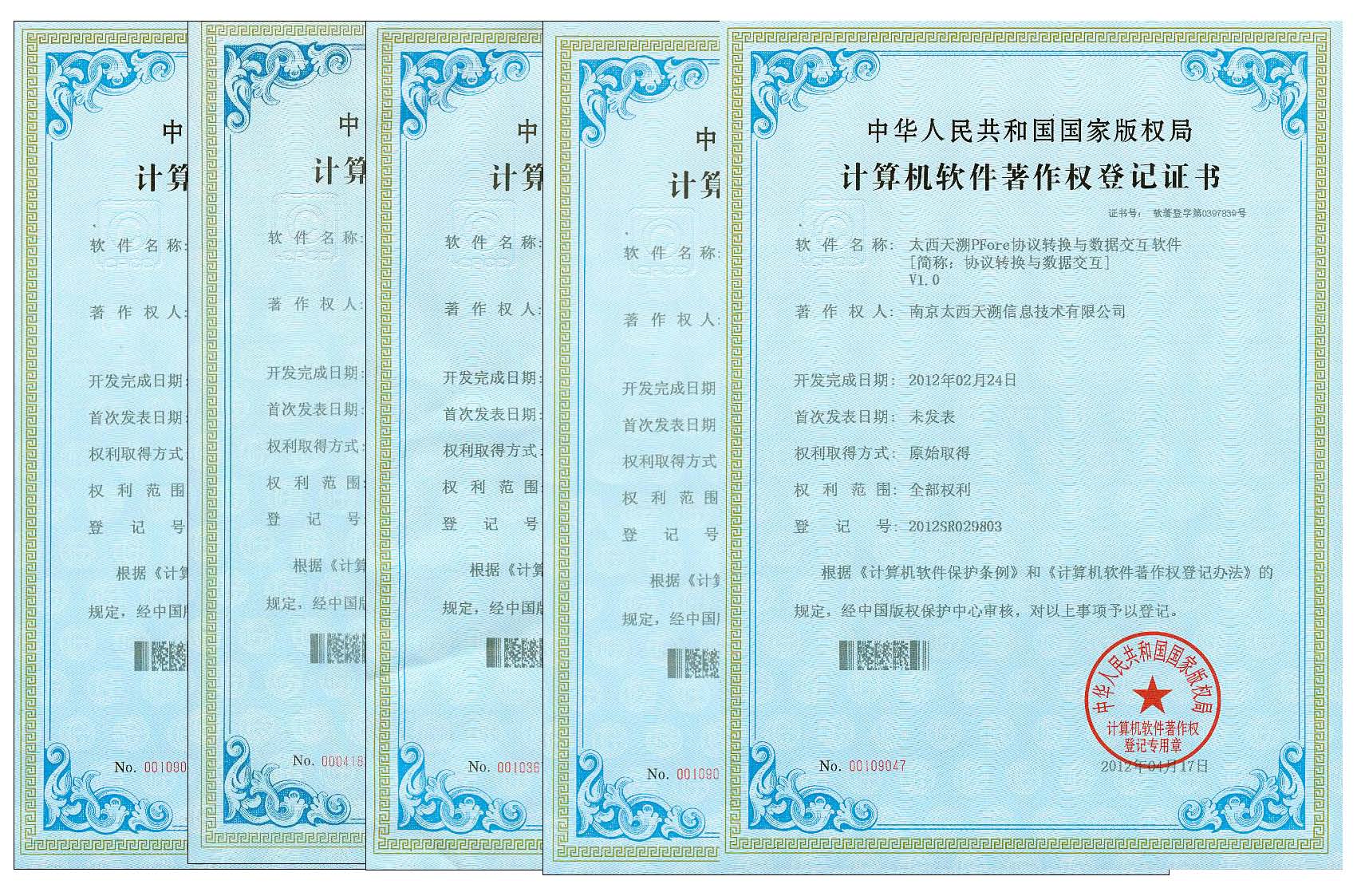 今年以来,南京太西天溯公司自主研发的五项软件取得