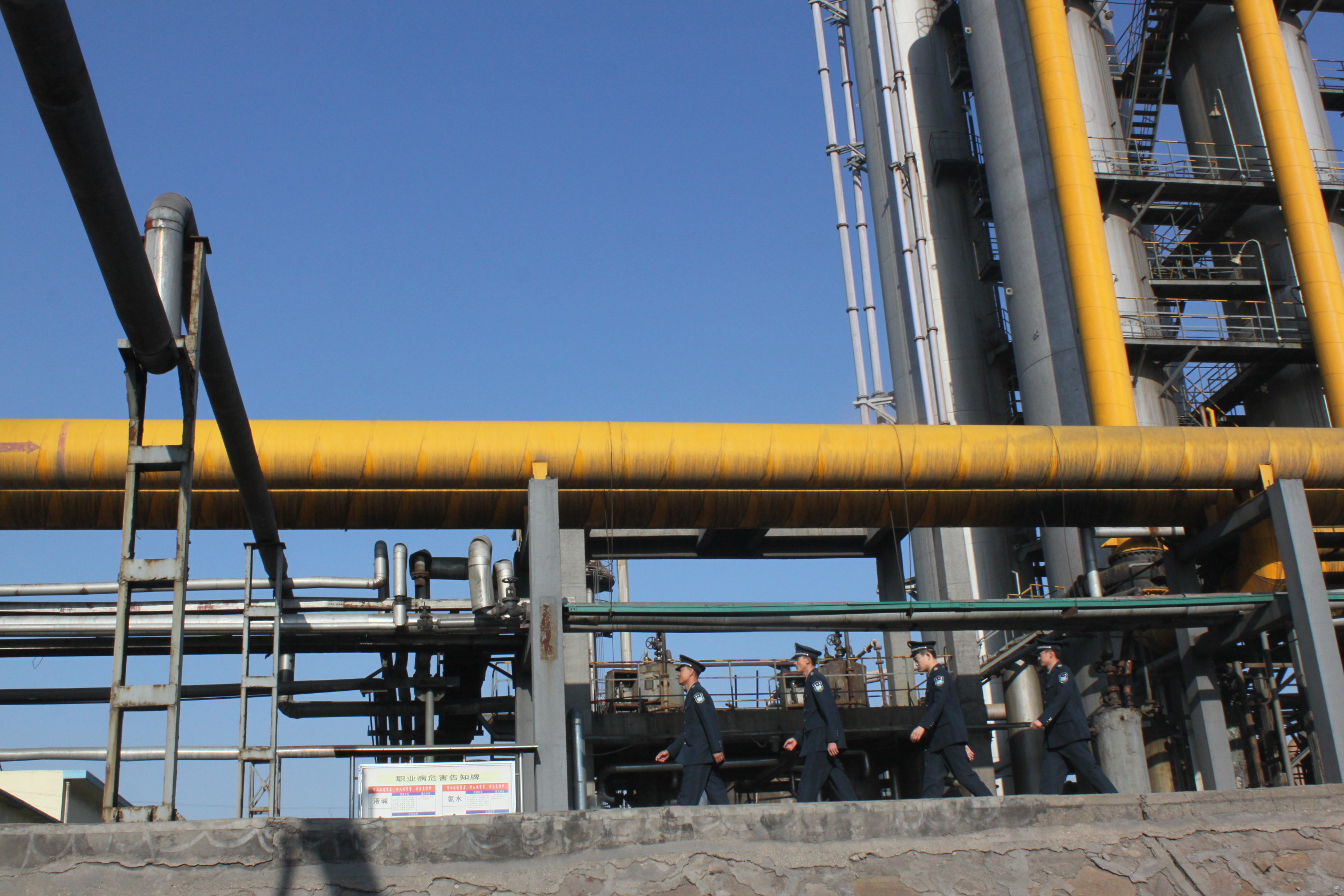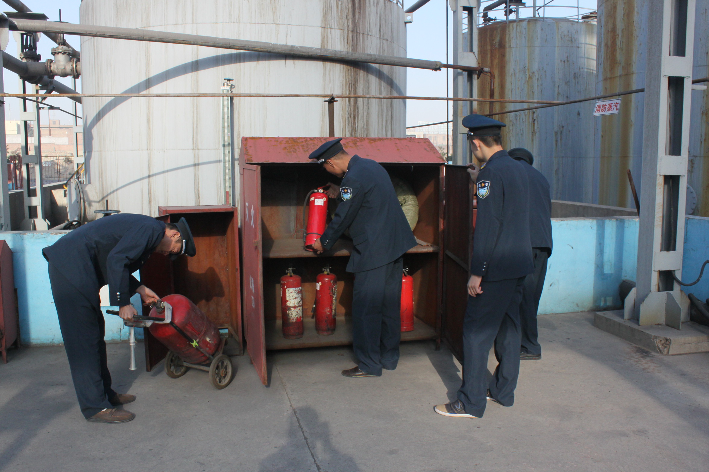 治安巡逻人员在化产车间粗笨工段检查消防设施